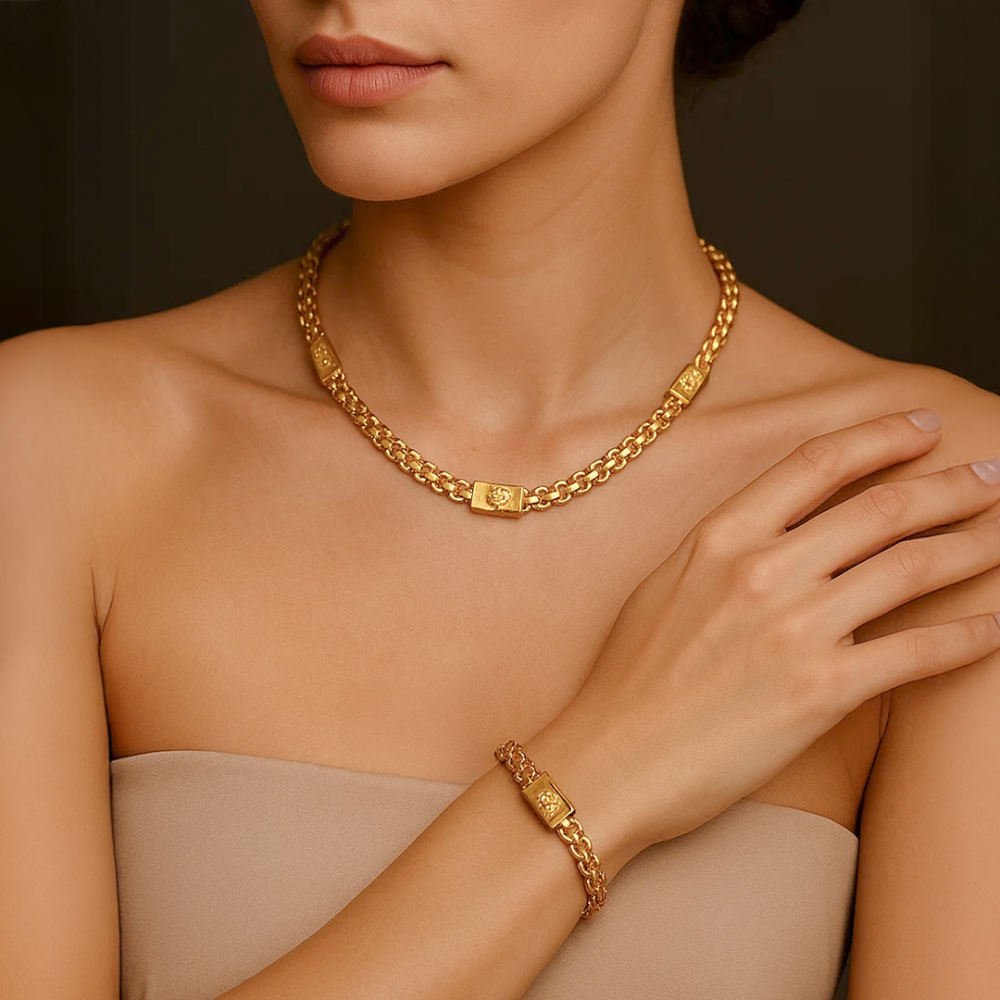 ارتقِ بأناقتك مع مجموعة قلادة وأساور ZEADear 18K مطلية بالذهب. تم تصميم هذه المجوهرات العصرية خصيصًا للرجال، حيث تجمع بين الفخامة واللمسة الحضرية العصرية، مما يجعلها الإكسسوار المثالي لأي مناسبة. سواء كنت في حفلة، أو في نزهة غير رسمية، أو في أمسية مميزة، فإن هذه المجموعة تضمن لك إطلالة رائعة وجذابة.